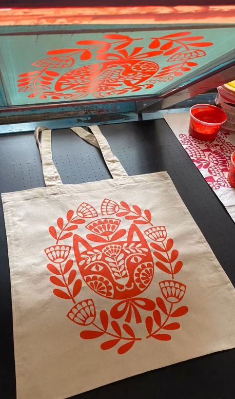 Hand screen-printed tote bag by Karoline Rerrie.