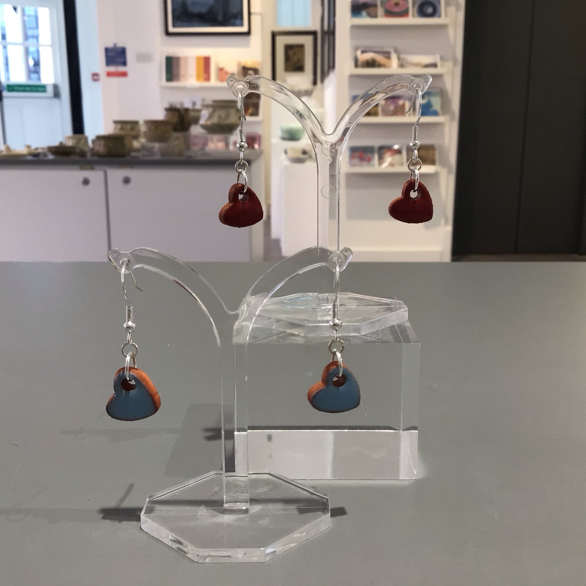One Pair of Glazed Ceramic Heart Earrings with Silver Plated Hooks by Automaton Ceramics.