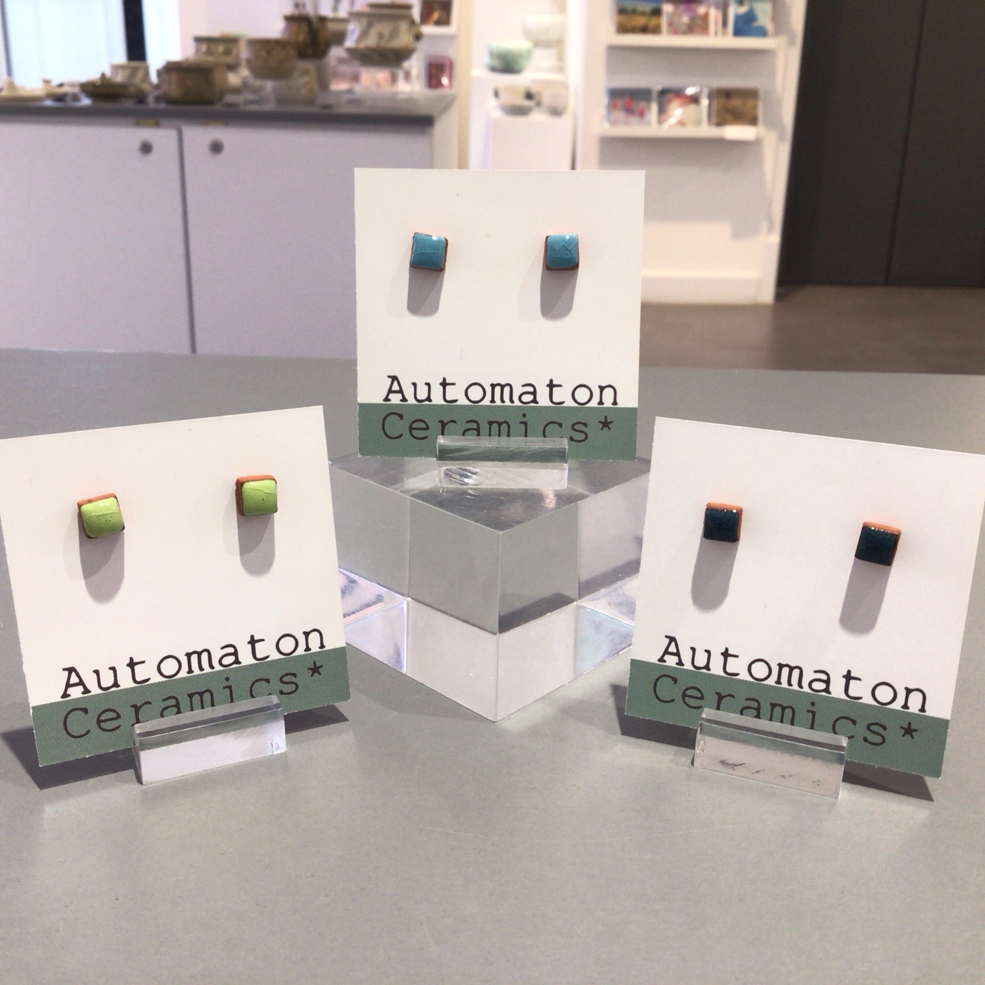 One Pair of Square Glazed Ceramic Stud Earrings with Stainless Steel Butterfly Backs by Automaton Ceramics.