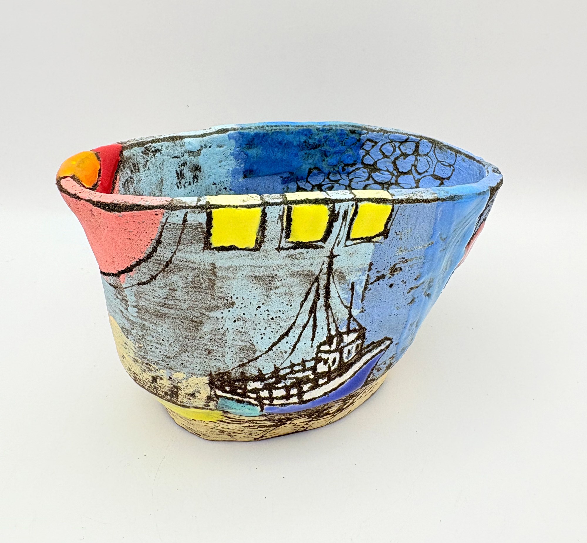 Hand-built from black stoneware clay decorated with engobes and glazes by Katherine Taylor Ceramics.