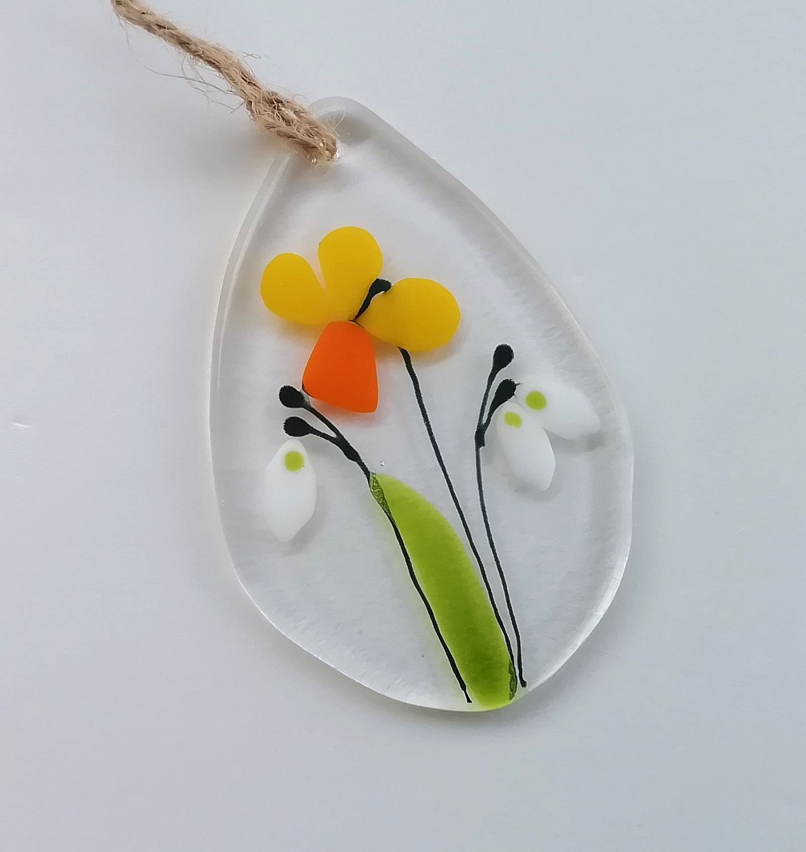 Fused glass daffodil sun-catcher with twine by WhimsicalFusing.