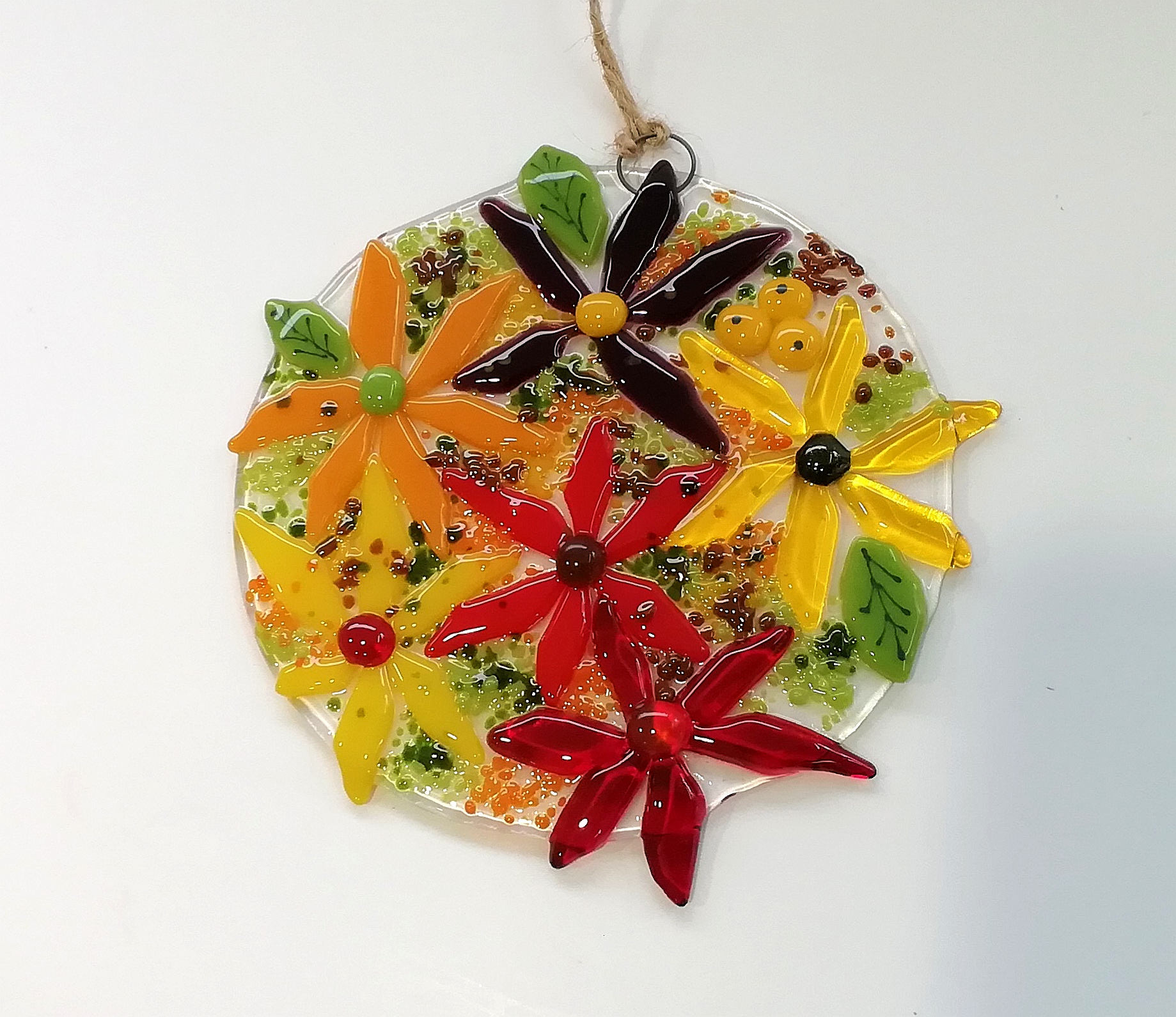 Fused glass and twine dahlia circle sun-catcher by Whimsical Fusing.