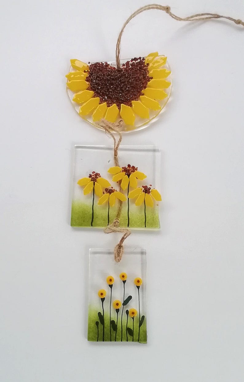Fused glass and twine sunflower hanger by Whimsical Fusing.