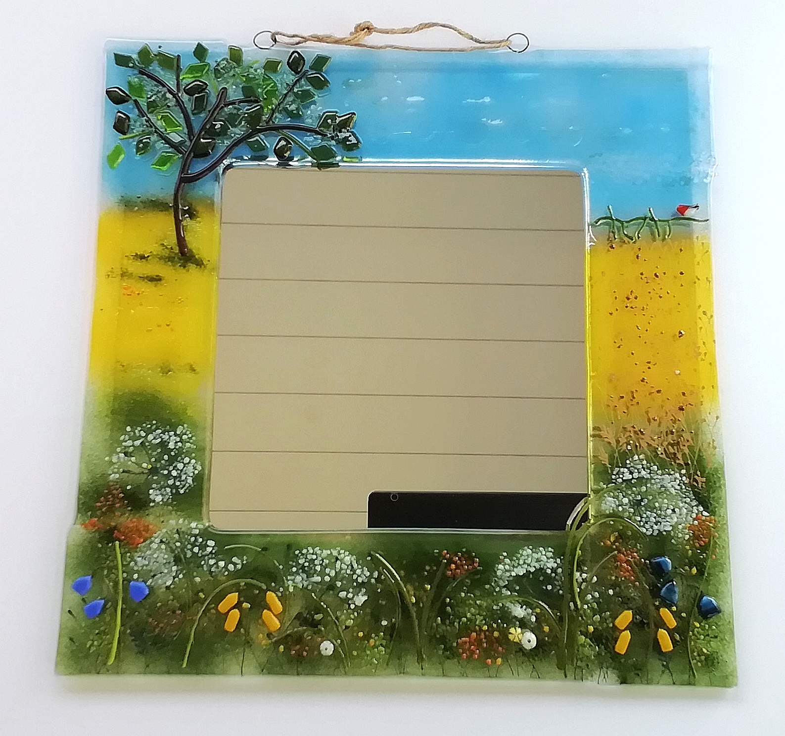 Mirror in fused glass frame with twine hanger by Whimsical Fusing.