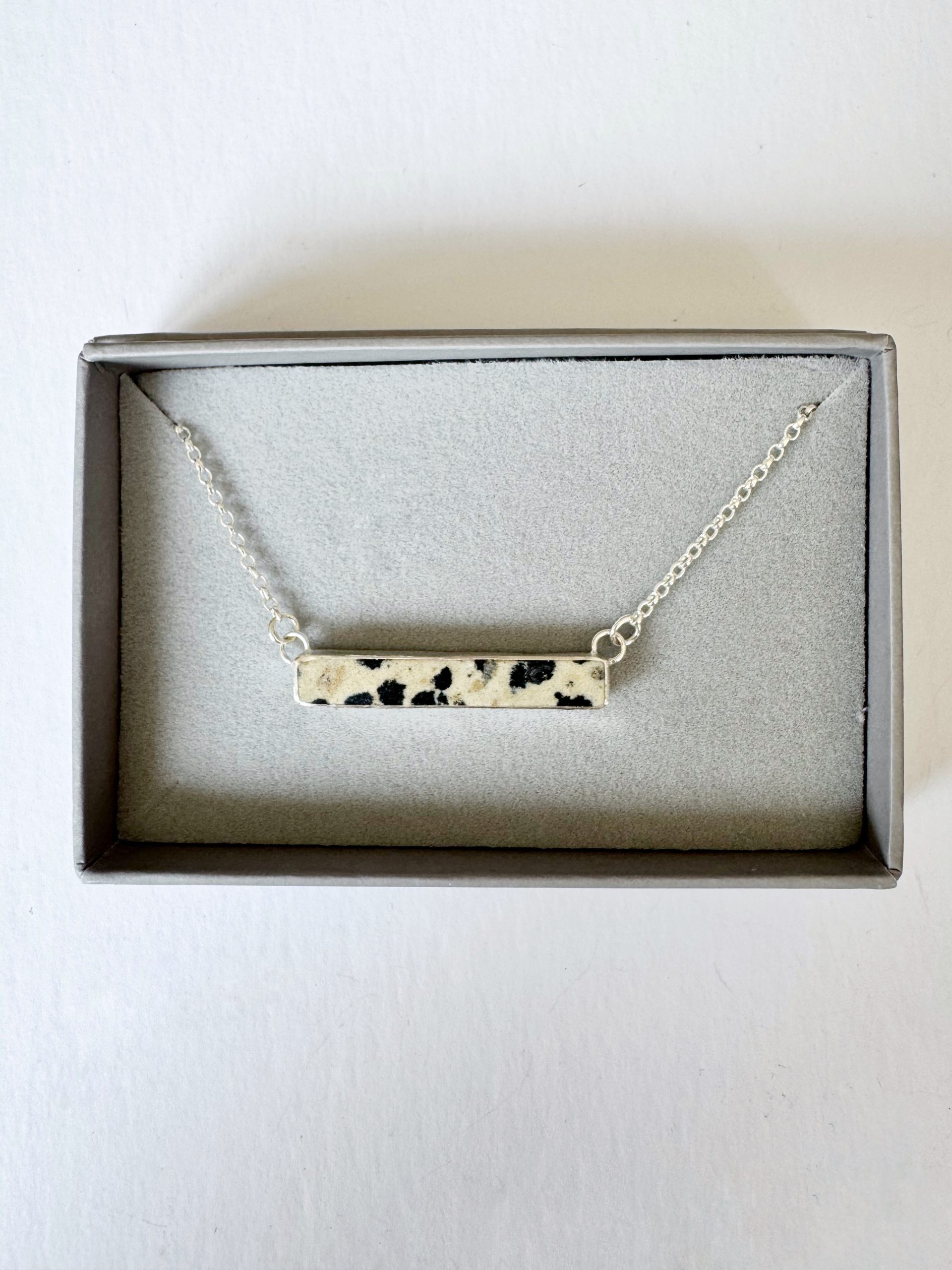 Dalmatian jasper bar pendant on a silver 16-17” chain with extender by 76 silver.