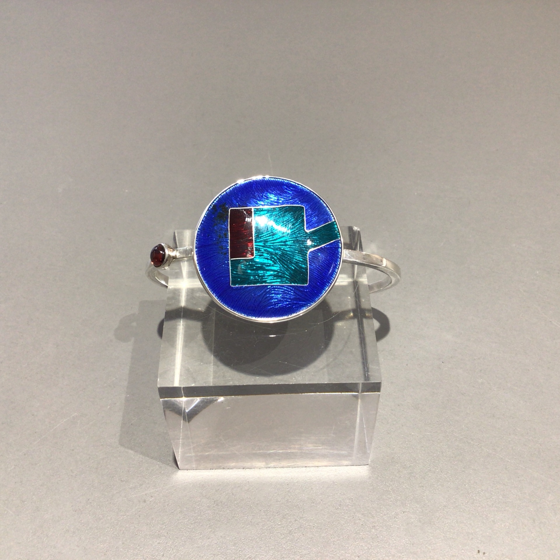 999 silver bangle with blue, turquoise and red enamel and a garnet by LasMan Jewellery.