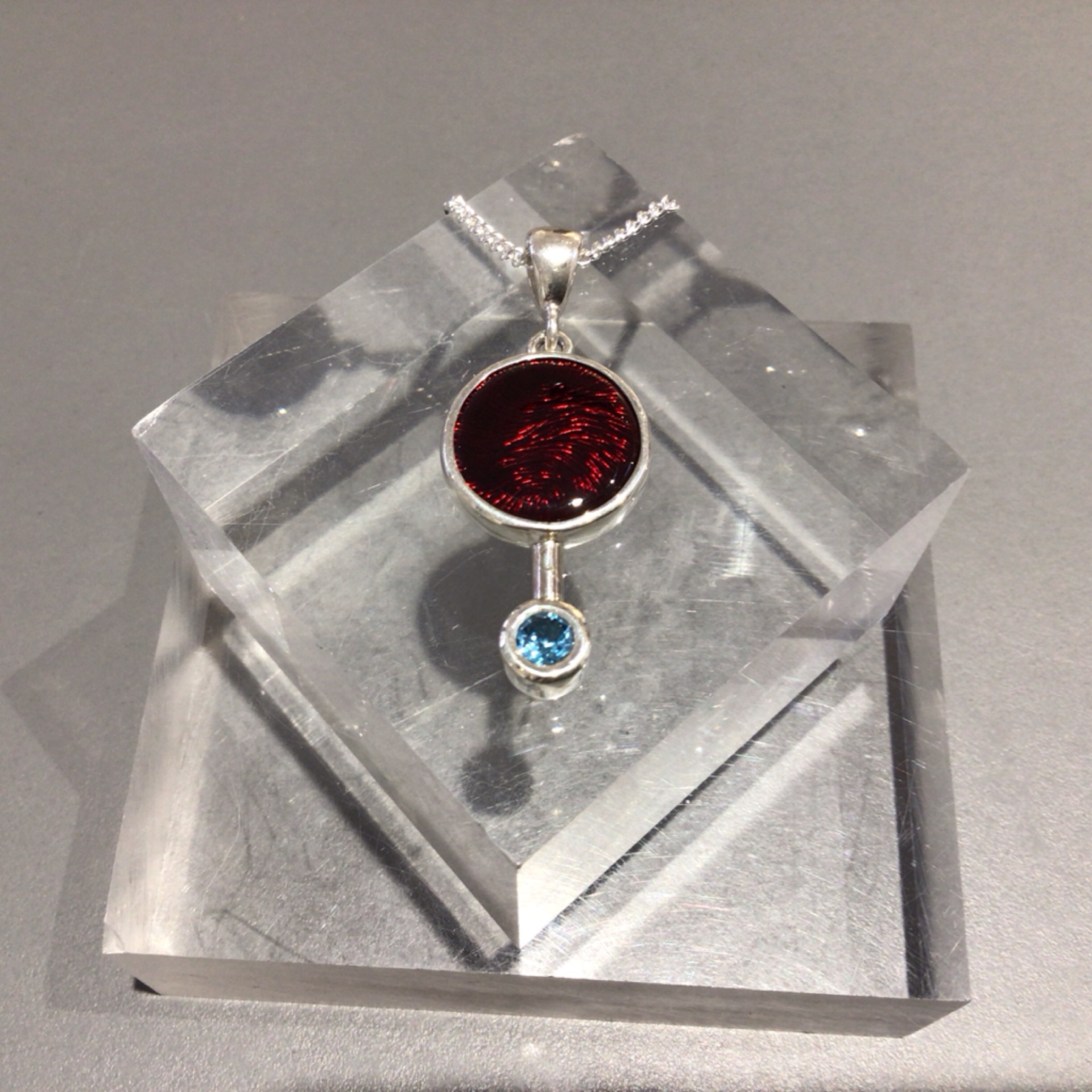 Deep red enamel on engraved 999 silver pendant with topaz gemstone setting and 925 silver hardware by Las Man Jewelry.