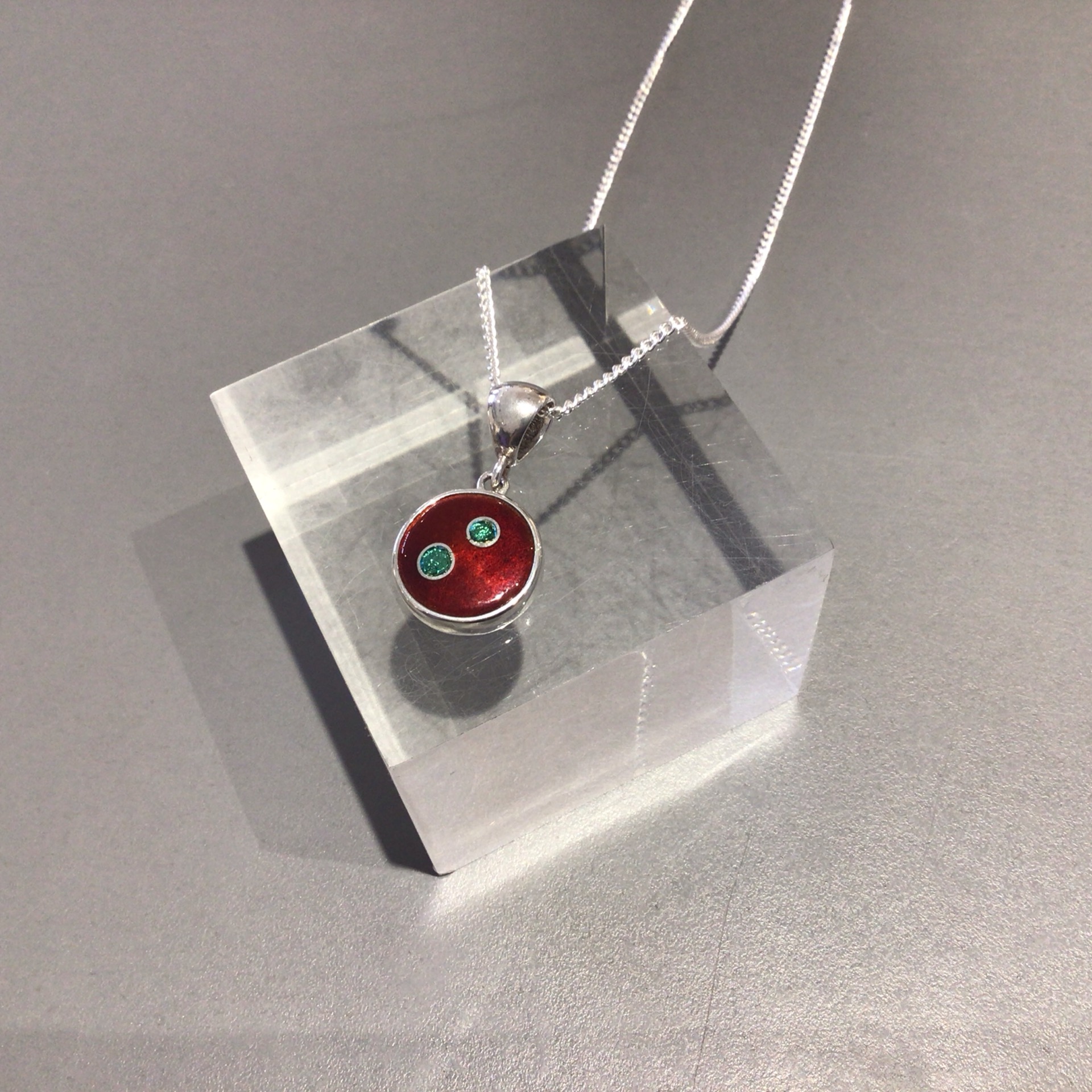 Red & turquoise enamel with silver wire & gold foil details on 999 silver with 925 silver hardware by Las Man Jewelry.