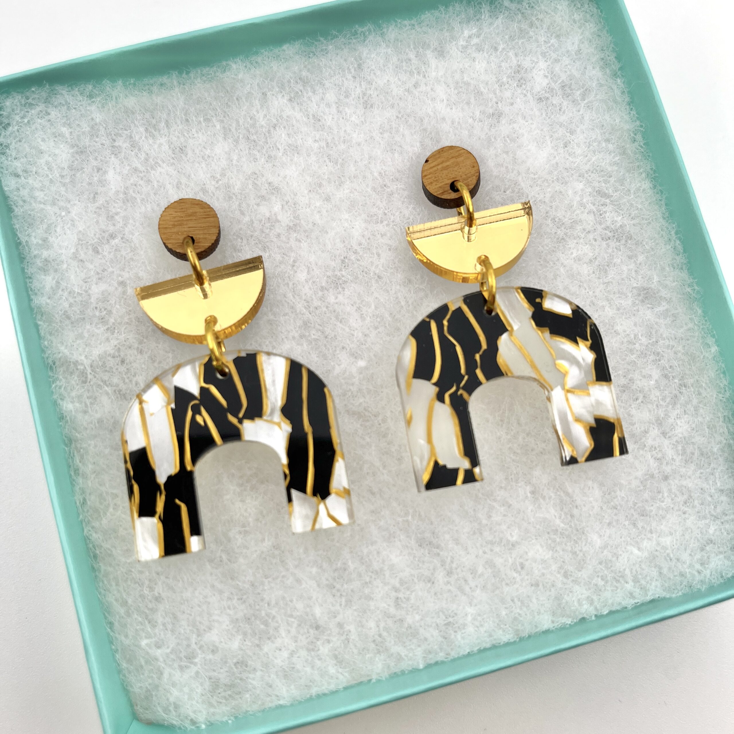 Three-part earrings in walnut wood and acrylic with stainless steel stud posts by The Cluttery.