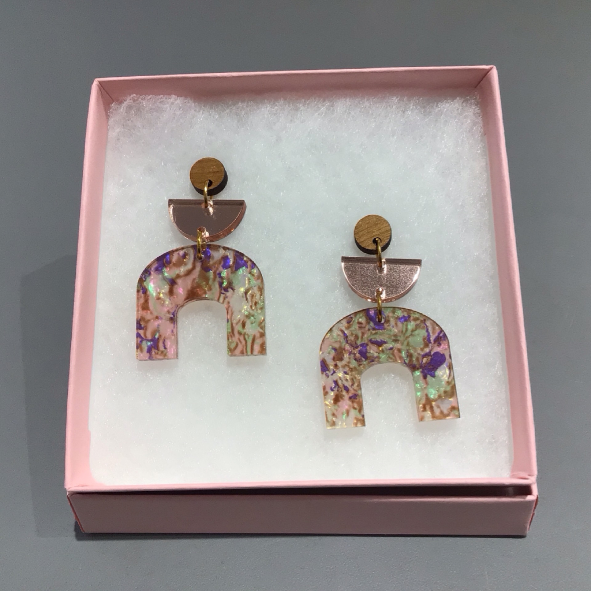 Pink tie-dye speakeasy earrings in walnut wood and acrylic with stainless steel butterfly-back studs by The Cluttery.