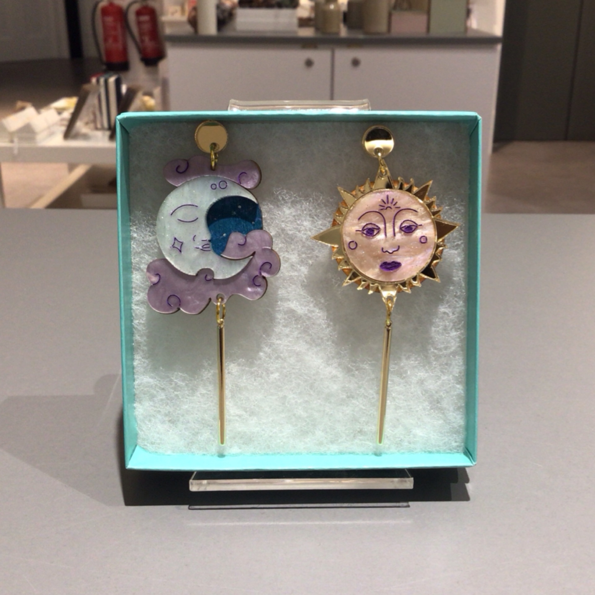 Mismatched sun and moon faces in acrylic and hand-painted wood with brass droppers by The Cluttery.